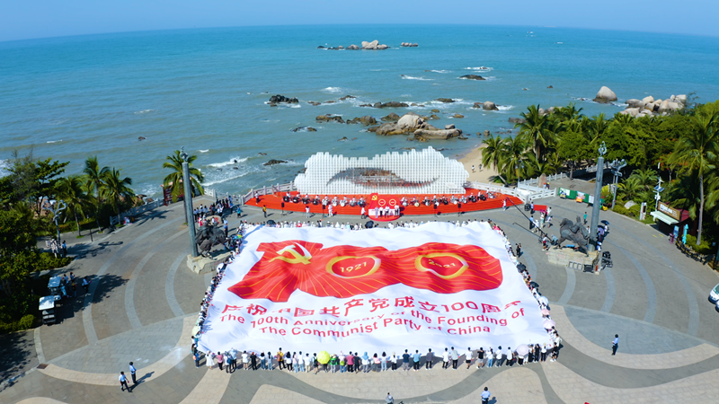 “我们走在大路上,意气风发斗志昂扬……”随着《我们走在大路上》熟悉旋律的响起,在主会场天涯海角游览区,市民游客和景区工作人员仰望天空挥舞着旗帜,在架子鼓节奏中共同合唱歌曲。由数百人方阵撑起的千平巨幅建党100周年旗帜在天涯海角沙滩上迎着海风翩翩起舞;在分会场,巨幅建党100周年旗帜在大小洞天鳌山山巅、在鹿回头的雕像下,迎着海风与朝阳徐徐展开。在三亚国际体育产业园体育中心,200名来自各地不同行业、不同年龄的市民齐声高歌,用真挚的情感和饱满的热情表达着对党和祖国深深的爱。
