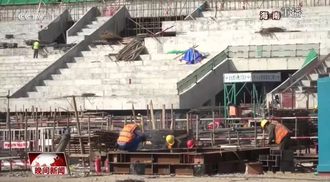 三亚市体育场是三亚国际体育产业园的核心项目,也是亚沙会闭幕式举办地,建筑面积8.6万平方米,地上四层,设计座位4.5万个。该项目去年9月18日开工,经2300多名建筑工人日夜奋战,今年1月22日主体建筑实现封顶。由于当时有一条地下水渠还在供水不能施工,体育场东西看台都留下50米宽的缺口没有合拢。